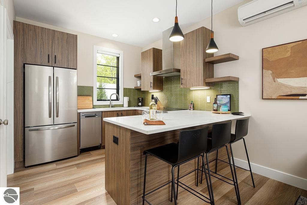 LOCATION! A newly built luxury townhome in the HEART of Traverse City. This end-unit townhome, completed in 2025, is ideally located near the base of Old Mission Peninsula - just a brief walk to Bryant Park, the Civic Center, Bardon's Ice Cream and minutes from downtown. Located within a show-stopping townhome community known as Hamilton Place. HP is thoughtfully designed community where its residents enjoy shared amenities including gas grills, gas fire pit gathering spaces, and a pergola with a long outdoor dining table. Short-term rentals are permitted, offering both lifestyle flexibility and income potential. Inside, the townhome features a fully equipped kitchen with appliances, in-unit washer and dryer, two bedrooms, and two full bathrooms. The property is offered turnkey, complete with high-end furniture and all essential housewares - everything from cookware to dishware is included. Additional highlights include Marvin casement windows with built-in blinds, glass-enclosed tile showers, heated bathroom floors, individual climate control units in each bedroom and the main living area, smart TVs throughout, and a designated parking space. A streamlined rental management program is already established, giving owners the option to generate income with ease. Alternatively, owners can self-manage, or hire a management company of their choosing! The opportunities are endless. Solidify your piece of Traverse City, MI!